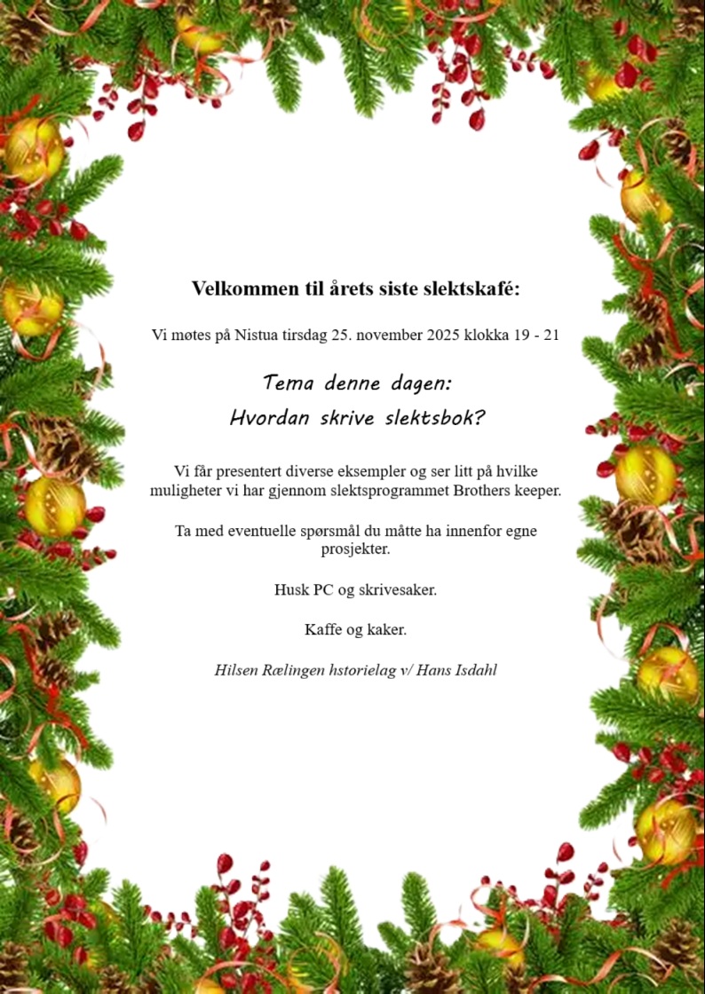 Årets siste slektskafé er tirsdag 25. november klokka 19:00 i Nistua på Rælingen bygdetun. Vi skal snakke litt om å lage slektsbok. Hvordan gjør vi det? Hvorfor gjør vi det? Hvilke alternative måter kan man lage slektsbok på? Har du egne produkter å vise fram: Ta dem med.
