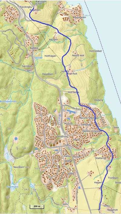 På bildet ser vi ei avmerking av hvor veien går. Denne delen er i dag godt merket fra kirka og fram til Skovholt, med informative skilt, og den holdes ved like slik at det er enkelt å følge den fram til Hektnersletta.